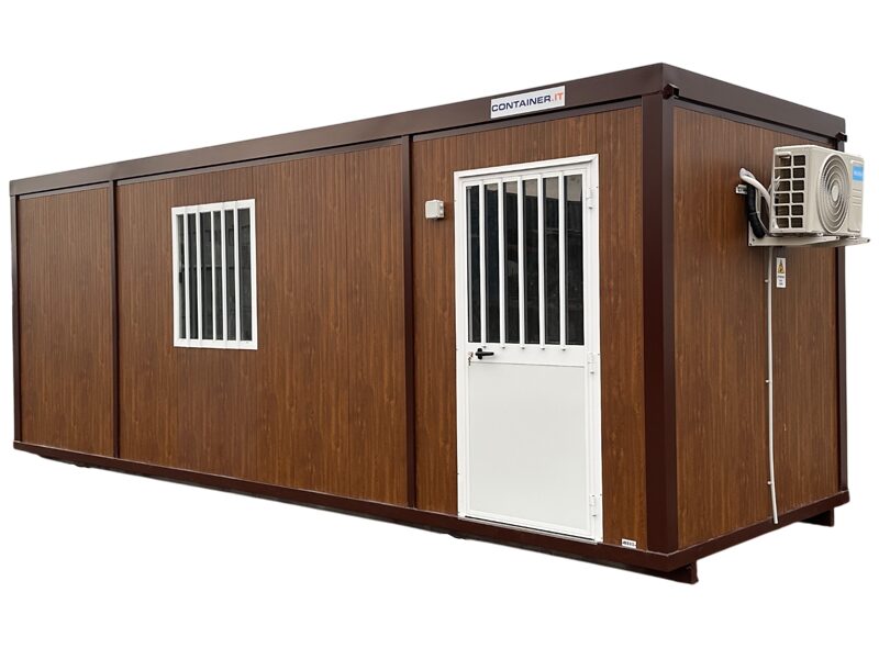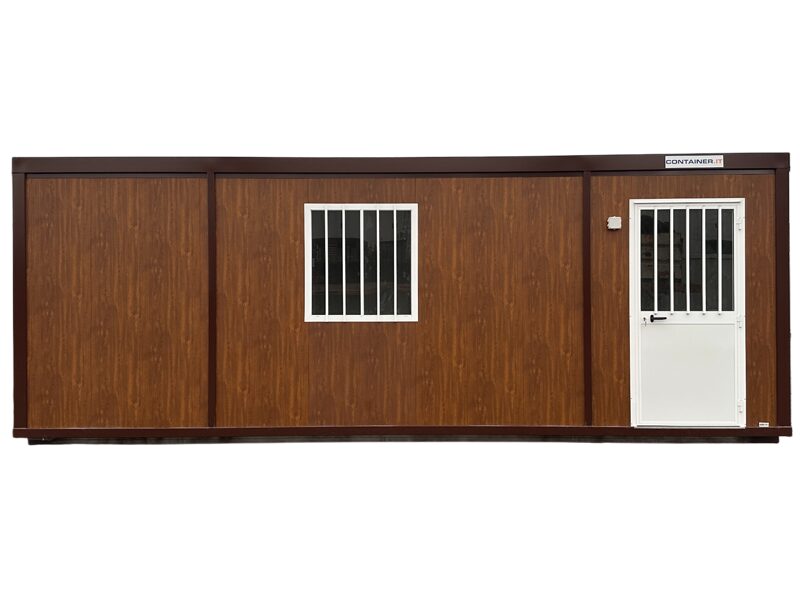 Il box prefabbricato 7 metri Con Bagno e Doccia, modello CORTINA, si differenzia da quello standard, per le pareti e i profili verniciati, effetto legno.